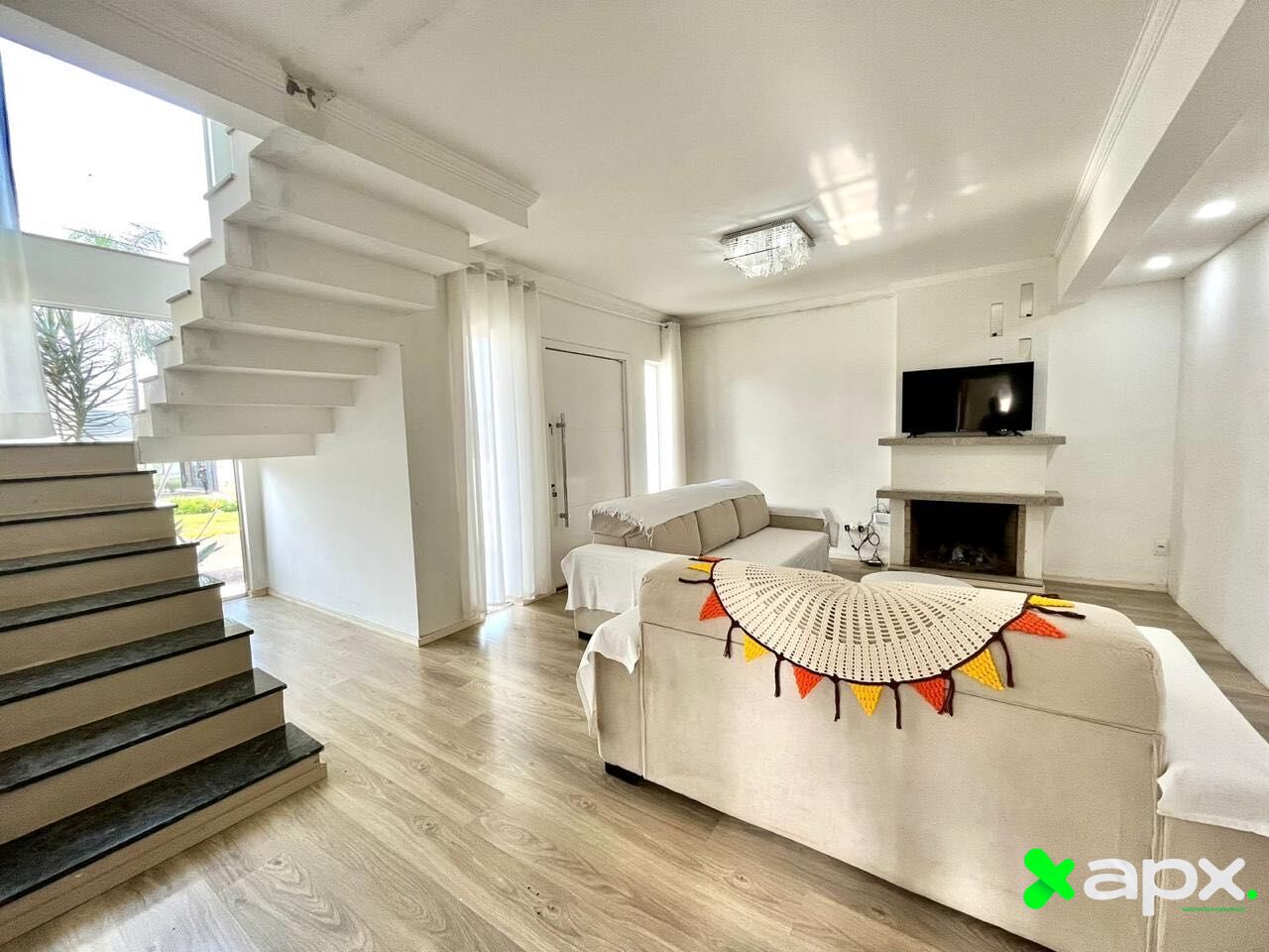 A casa em seu primeiro pavimento é composta por: sala com dois ambientes e lareira, lavabo, cozinha e área de serviço.