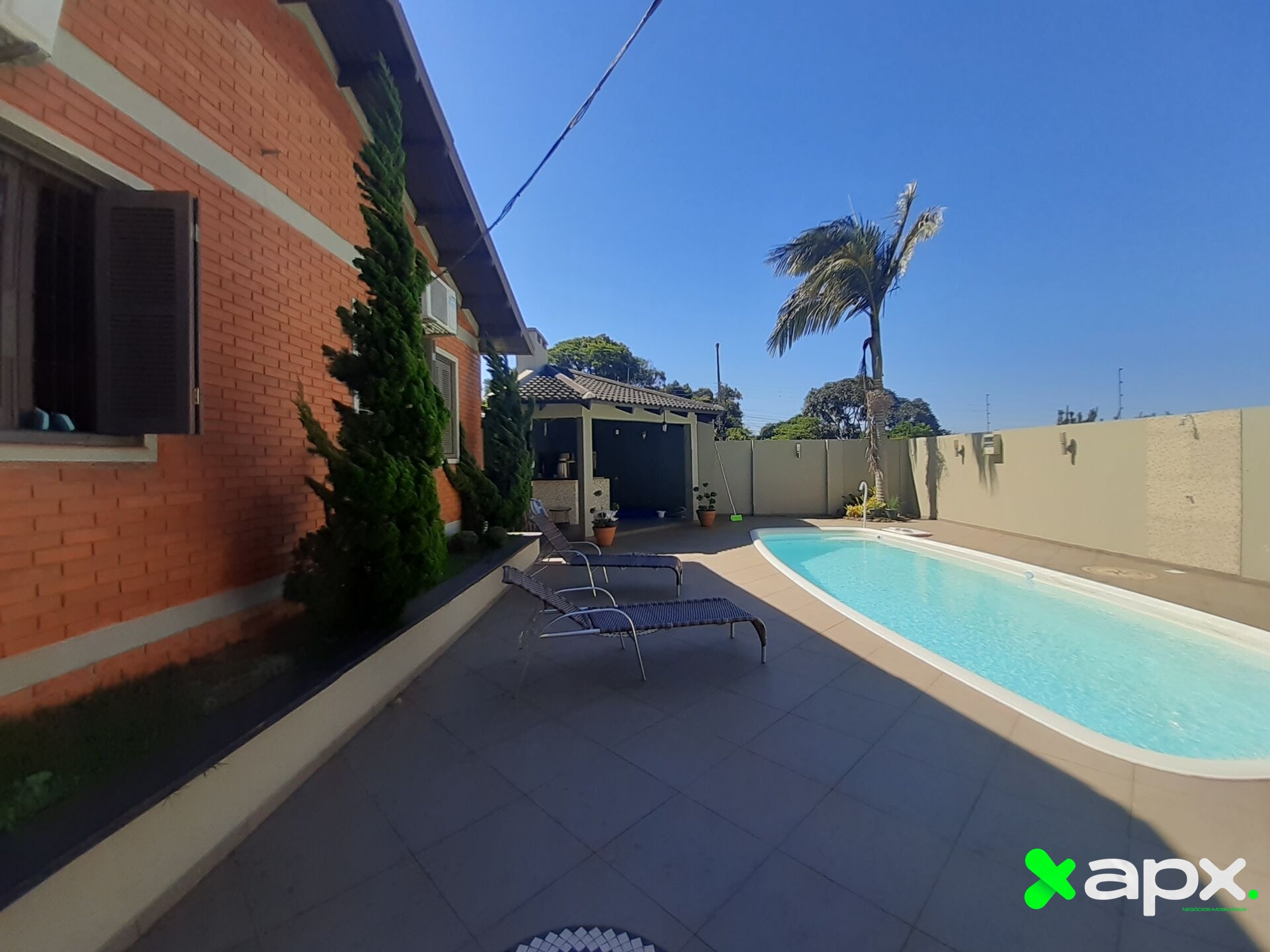 Quiosque aberto de frente para piscina com churrasqueira rotativa;